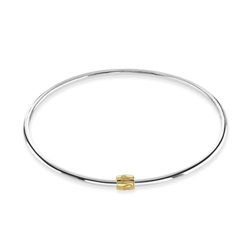 Sleek sterling silver bangle with 14 carat gold plated charm that features Gay Pride etched on the charm