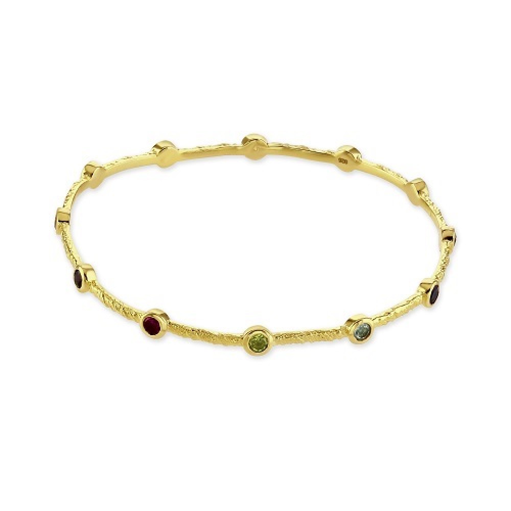 | Description | Stone sizes 3mm Regular size bangle Internal diameter of 63mm - 65mm this size fits the majority of women's wrists. Rainbow coloured –red orange yellow green blue and purple cubic zirconia stones Half micron gold vermeil 14 carat - sterling silver 925 |